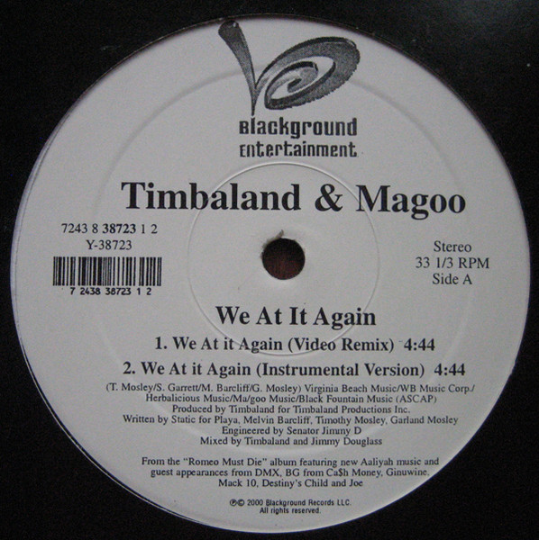 Format: 12" Label: Blackground Entertainment – 7243 8 38723 1 2 Country: US Year: 2000 Genre: RnB/Swing, Pop Rap Condition: VG+ Sleeve: VG Tracklist: A1 We At It Again (Video Remix) 4:44 A2 We At It Again (Instrumental Version) 4:44 B We At It Again ( Album Version) 4:44