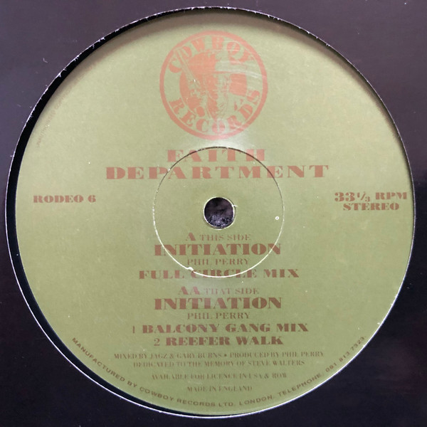 Format: 12" Label: Cowboy Records – RODEO 6 Country: UK Year: 1992 Genre: Progressive House, Trance, Dub Condition: VG+ Sleeve: Gen Tracklist: This Side A Initiation (Full Circle Mix) That Side AA1 Initiation (Balcony Gang Mix) AA2 Reefer Walk