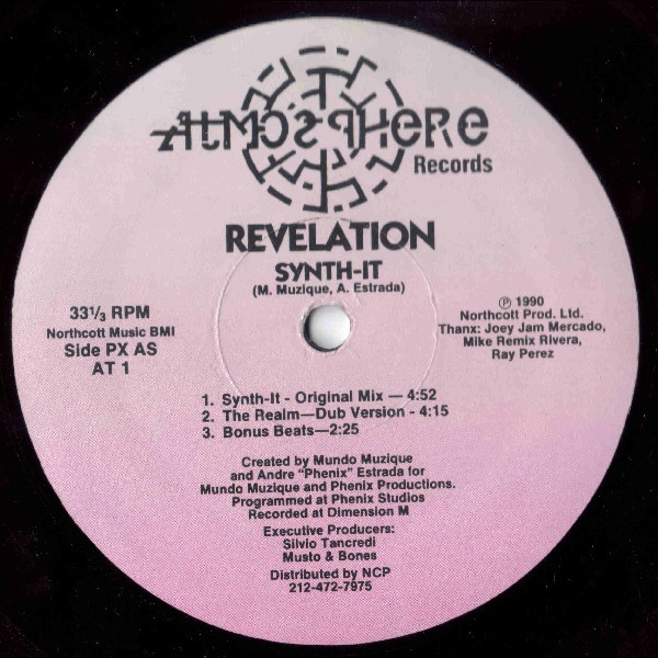 Format: 12" Label: Atmosphere Records – AT 1 Country: US Year: 1990 Genre: House, Techno, Electro, Freestyle Condition: VG+ Sleeve: Gen Tracklist: Side PX AS A1 Synth-It (Original Mix) 4:52 A2 The Realm (Dub Version) 4:15 A3 Bonus Beats 2:25 Side MM BS B1 First Power (Original Mix) 3:40 B2 First Power (Domination Dub) 6:20