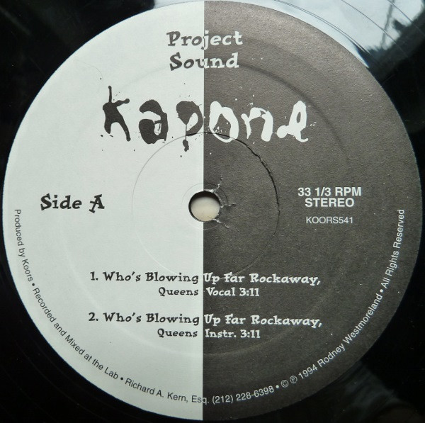 Format: 12" Label: Project Sound – KOORS541 Country: US Year: 1994 Genre: Hip Hop Condition: VG+ Sleeve: VG Tracklist: A1 Who's Blowing Up Far Rockaway, Queens (Vocal) 3:11 A2 Who's Blowing Up Far Rockaway, Queens (Instrumental) 3:11 B1 Never Slumber (Vocal) 3:54 B2 Never Slumber (Instrumental) 3:54 B3 In The Mix (Vocal) 3:47