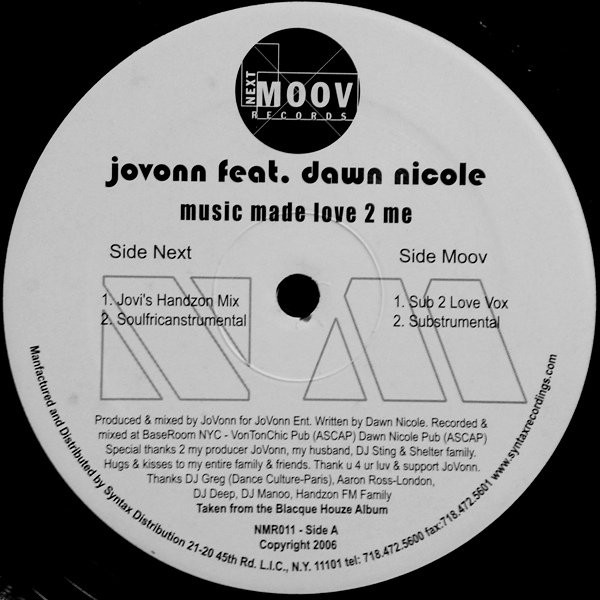 Format: 12" Label: Next Moov Records – NMR011 Country: US Year: 2006 Genre: House Condition: VG+ Sleeve: Gen Tracklist: Side Next A1 Music Made Love 2 Me (Jovi's Handzon Mix) A2 Music Made Love 2 Me (Soulfricanstrumental) Side Moov B1 Music Made Love 2 Me (Sub 2 Love Vox) B2 Music Made Love 2 Me (Substrumental)