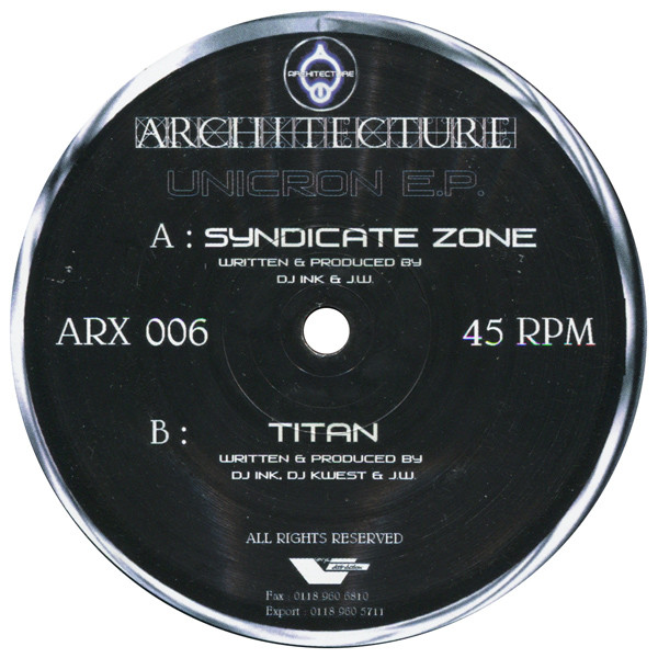 Format: 2x12" Label: Architecture – ARX 006 Country: UK Year: 2000 Genre: Drum n Bass Condition: VG+ Sleeve: VG Tracklist: A DJ Ink & J.W.– Syndicate Zone 6:06 B DJ Ink, DJ Kwest & J.W.– Titan 6:17 C Nu Era & DJ Loxy – Cyborg 6:39 D Kemal & Rob Data – Lime 7:07